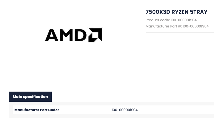 The CPU page shows a Manufacturer Part Code: 100-000001904, ditto a product code, titled as 7500X3D Ryzen 5 Tray which appears to be the smaller sibling of the Ryzen 5 7600X3D launched in 2024.